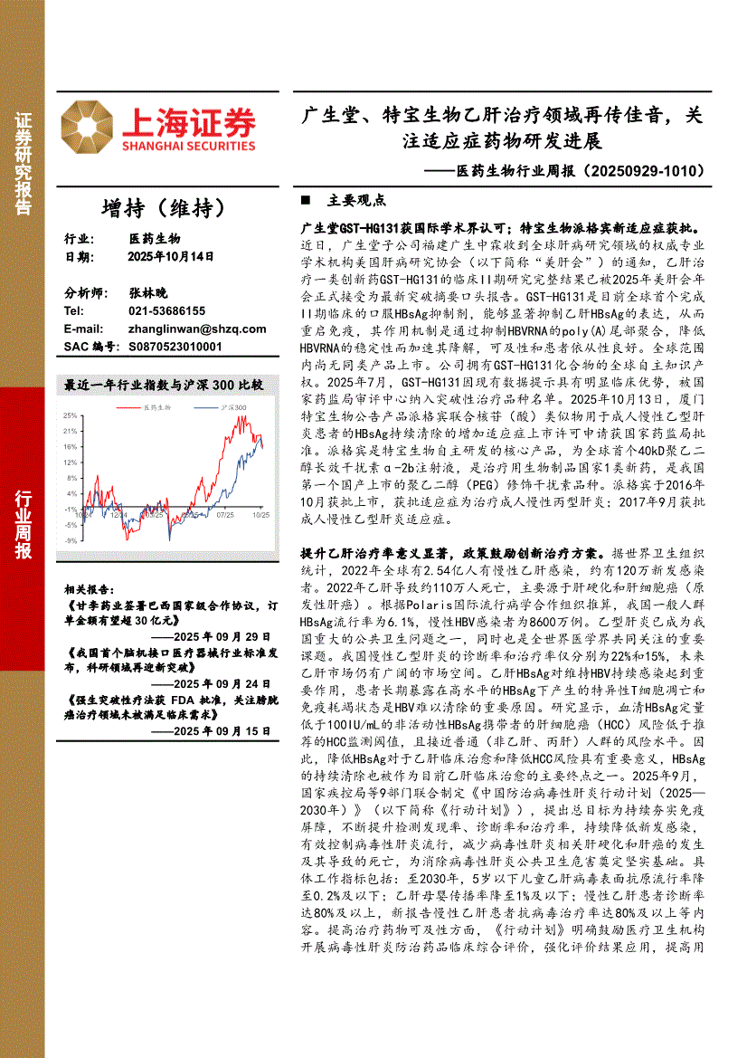 医药生物行业:上海证券-医药生物行业周报:广生堂、特宝生物乙肝治疗领域再传佳音,关注适应症药物研发进展-251014