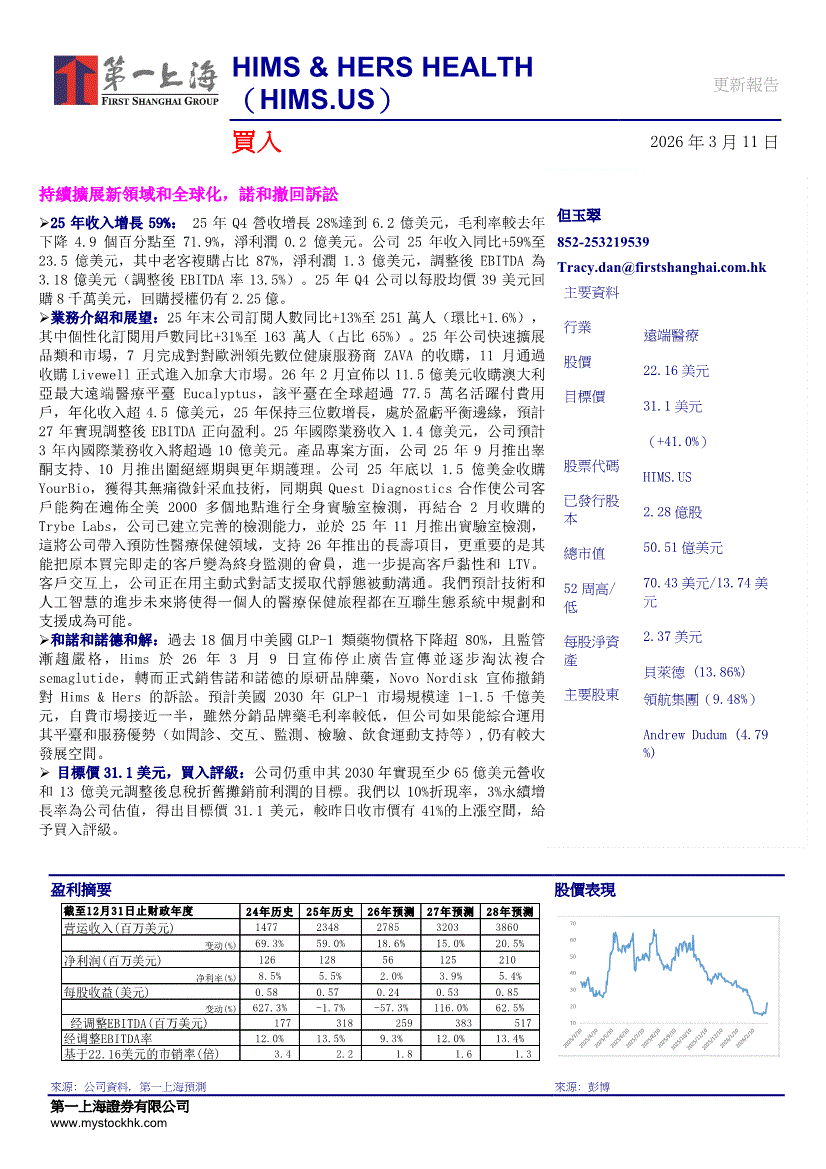 HIMS & HERS HEALTH:第一上海-HIMS & HERS HEALTH-HIMS.US-持续扩展新领域和全球化,诺和撤回诉讼-260311