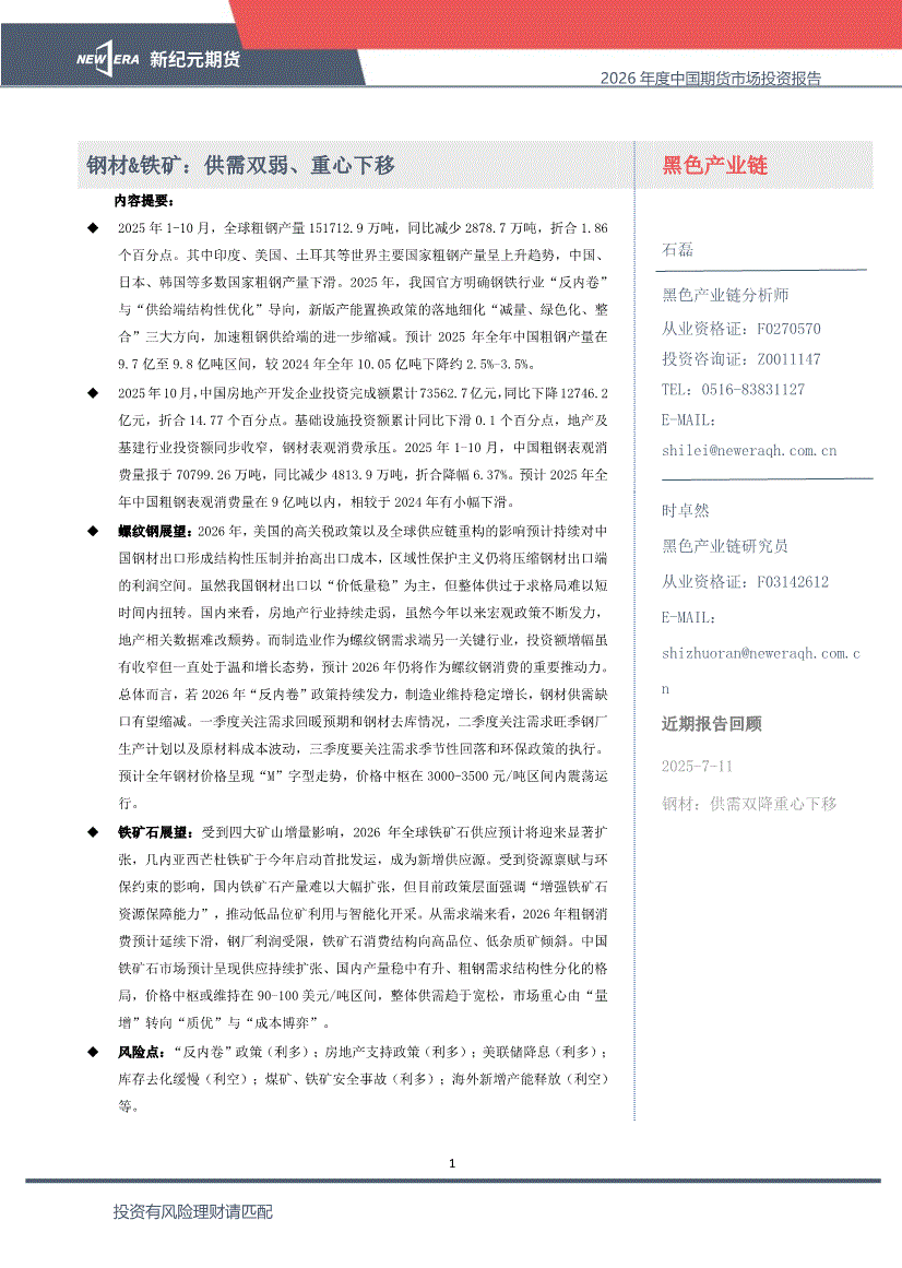 新纪元期货-2025年四季度中国期货市场投资报告:钢材,供需双降重心下移-250925