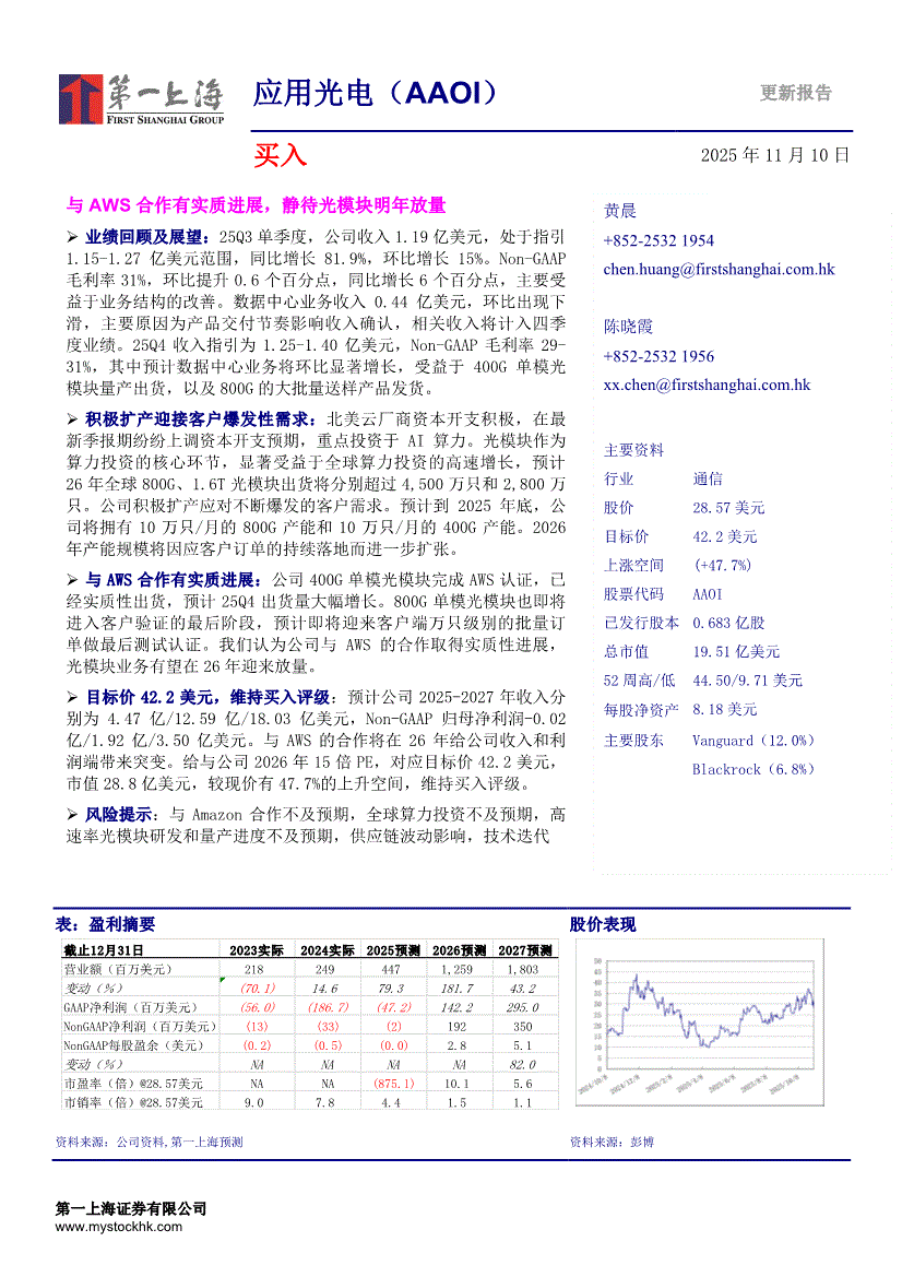 应用光电:第一上海-应用光电-AAOI.US-与AWS合作有实质进展,静待光模块明年放量-251110