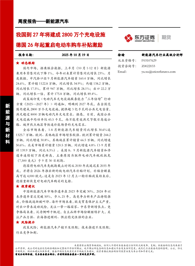 东证期货-新能源汽车周度报告:我国到27年将建成2800万个充电设施,德国26年起重启电动车购车补贴激励-251019