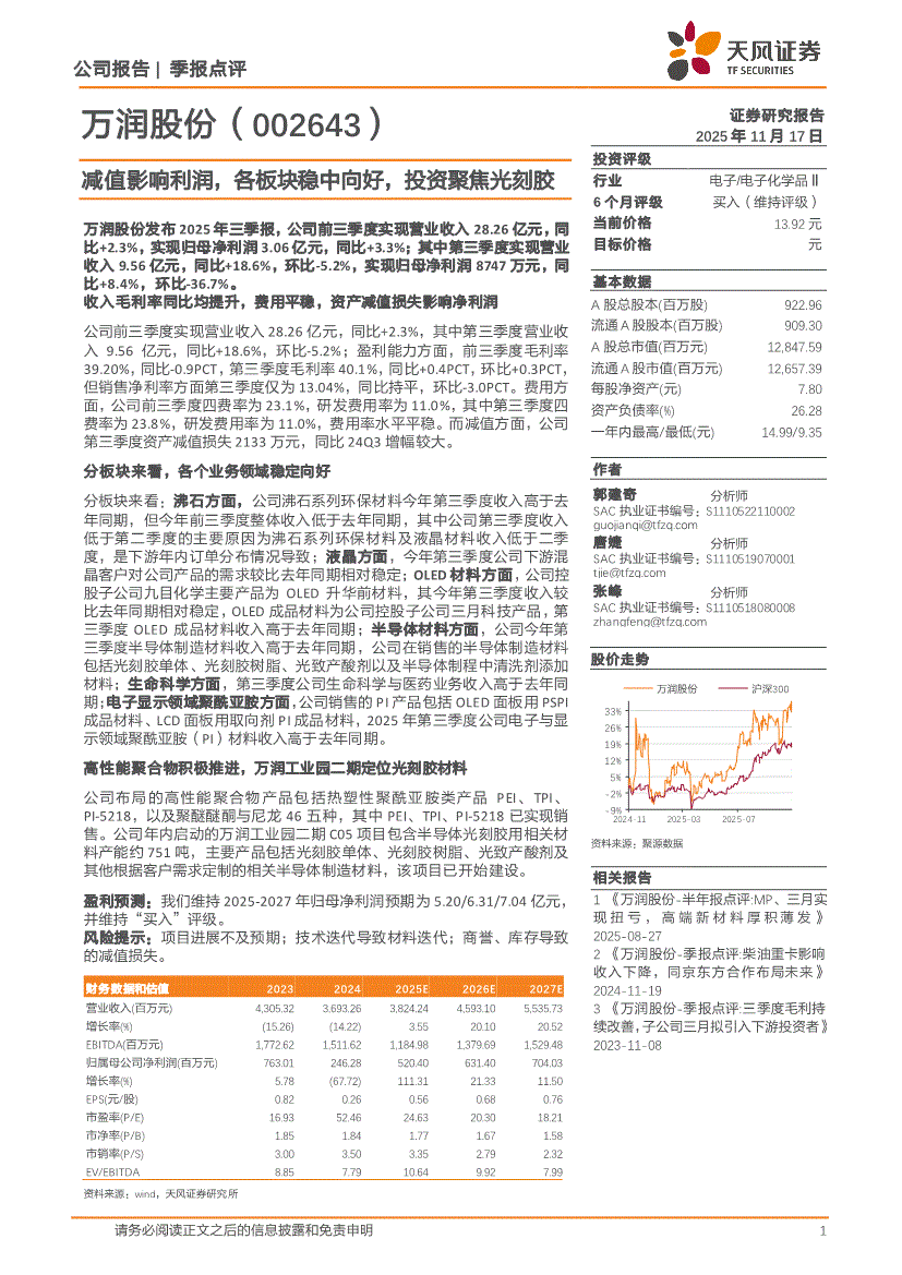 万润股份:天风证券-万润股份-002643-减值影响利润,各板块稳中向好,投资聚焦光刻胶-251117