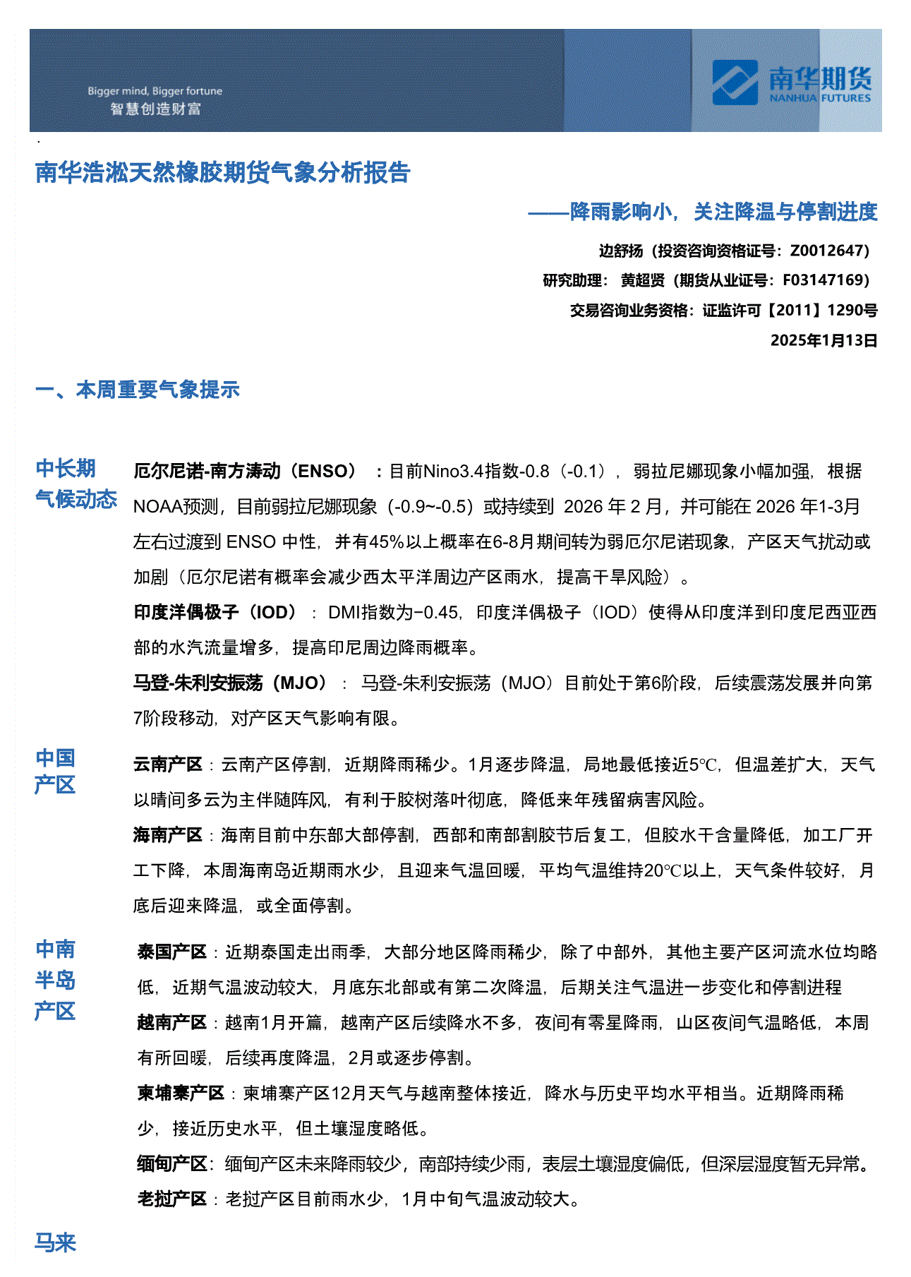 南华期货-浩淞天然橡胶期货气象分析报告:降雨影响小,关注降温与停割进度-260113