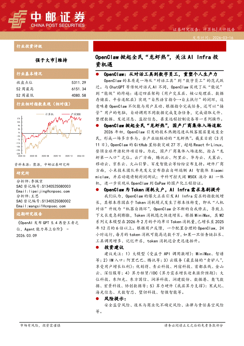 计算机行业:中邮证券-计算机行业:OpenClaw掀起全民“龙虾热“,关注AI Infra投资机遇-260316