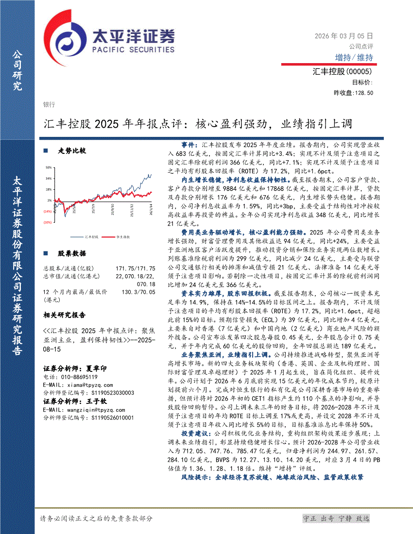 汇丰控股:太平洋证券-汇丰控股-0005.HK-2025年年报点评:核心盈利强劲,业绩指引上调-260305