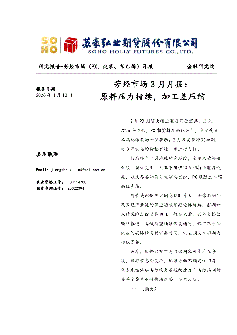 弘业期货-芳烃市场3月月报:原料压力持续,加工差压缩-260410