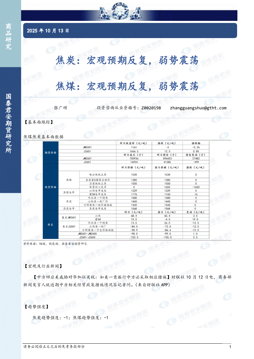 国泰君安期货-焦炭:宏观预期反复,弱势震荡,焦煤,宏观预期反复,弱势震荡-251013