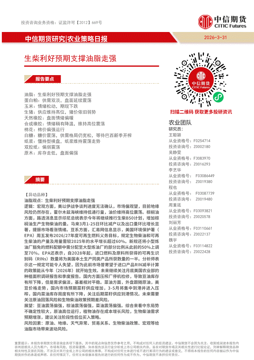 中信期货-农业策略日报:生柴利好预期支撑油脂走强-260331