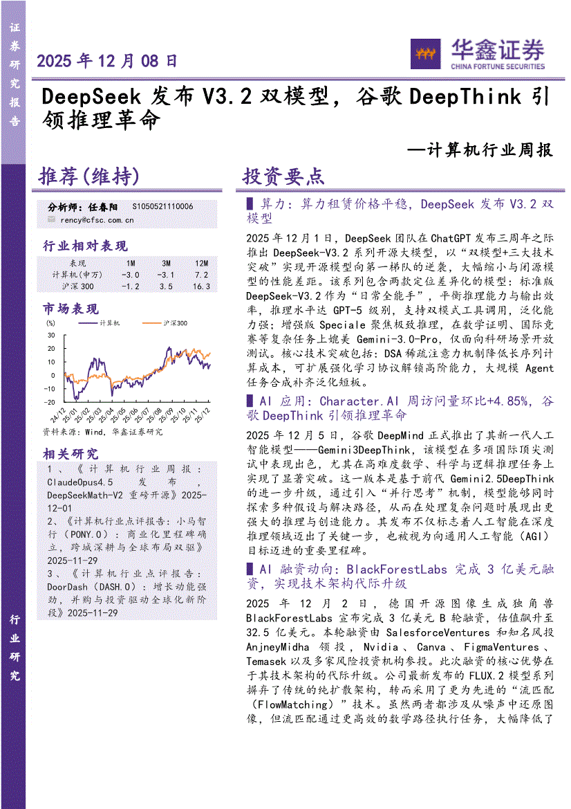 计算机行业:华鑫证券-计算机行业周报:DeepSeek发布V3.2双模型,谷歌DeepThink引领推理革命-251208