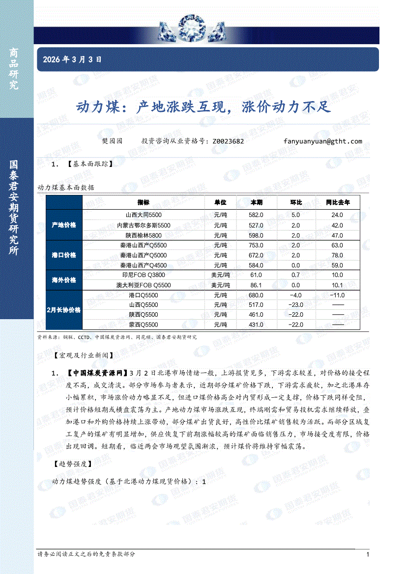 国泰君安期货-动力煤:产地涨跌互现,涨价动力不足-260303