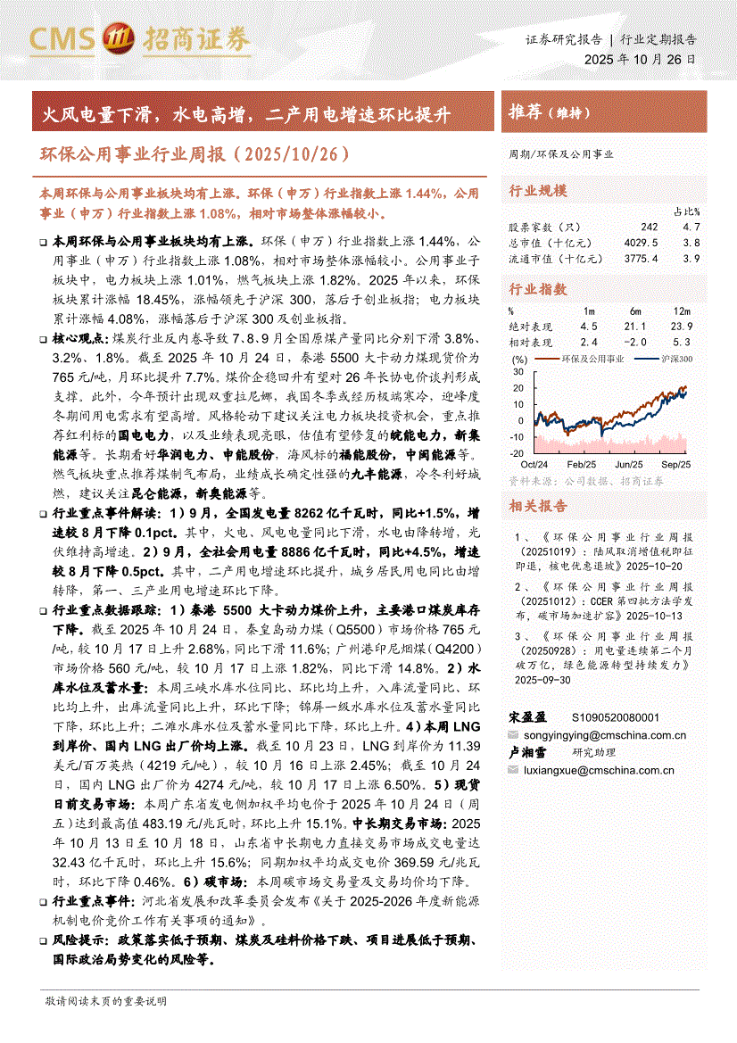环保公用事业行业:招商证券-环保公用事业行业周报:火风电量下滑,水电高增,二产用电增速环比提升-251026