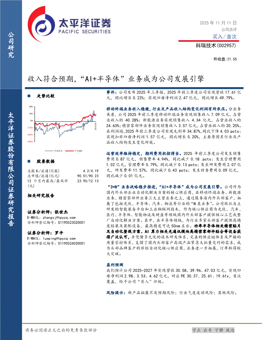 科瑞技术:太平洋证券-科瑞技术-002957-收入符合预期,“AI+半导体”业务成为公司发展引擎-251111