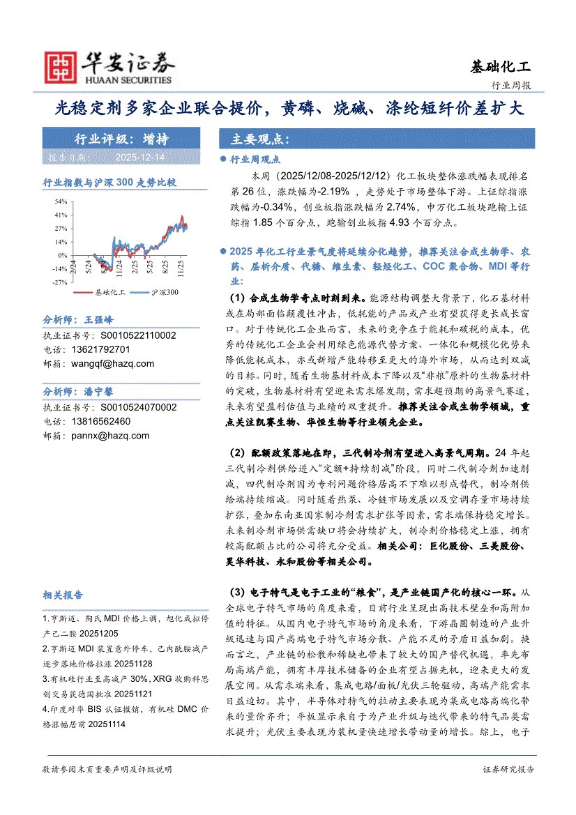 基础化工行业:华安证券-基础化工行业周报:光稳定剂多家企业联合提价,黄磷、烧碱、涤纶短纤价差扩大-251214