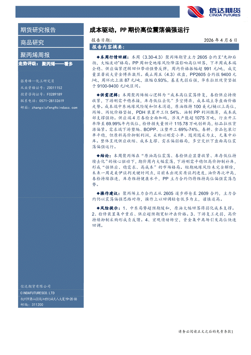 信达期货-聚丙烯周报:成本驱动,PP期价高位震荡偏强运行-260406