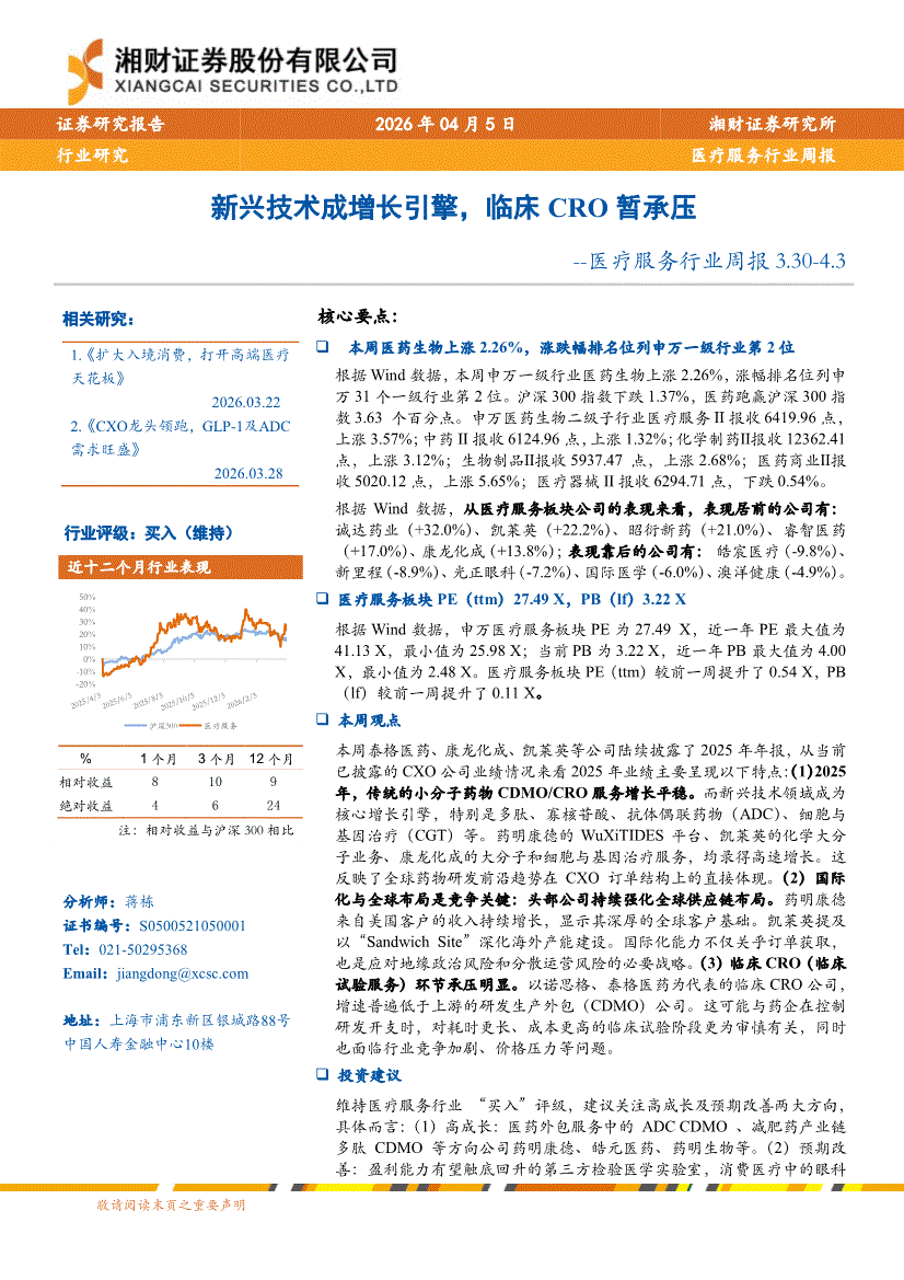 医疗服务行业:湘财证券-医疗服务行业周报:新兴技术成增长引擎,临床CRO暂承压-260405