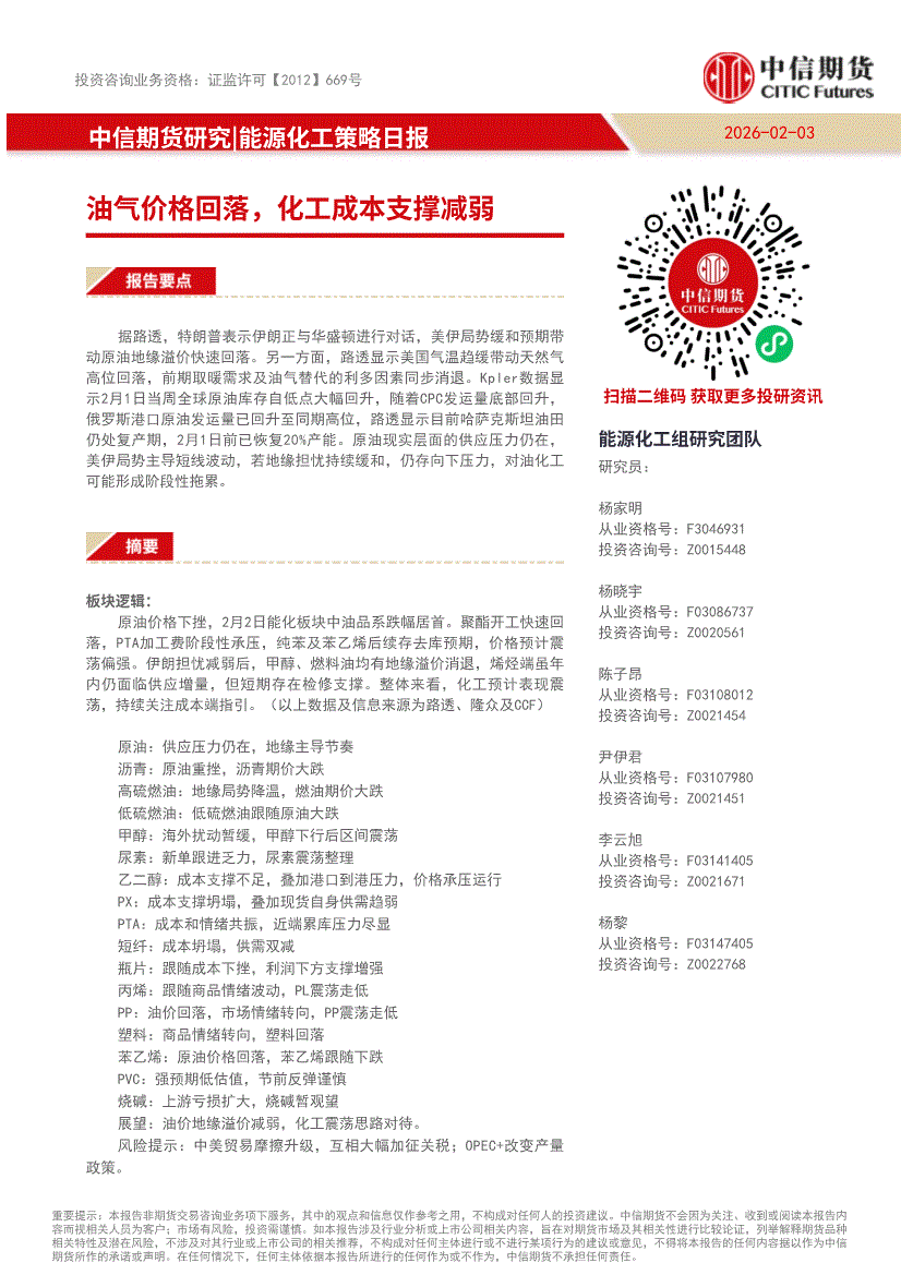 中信期货-能源化工策略日报:油气价格回落,化工成本支撑减弱-260203