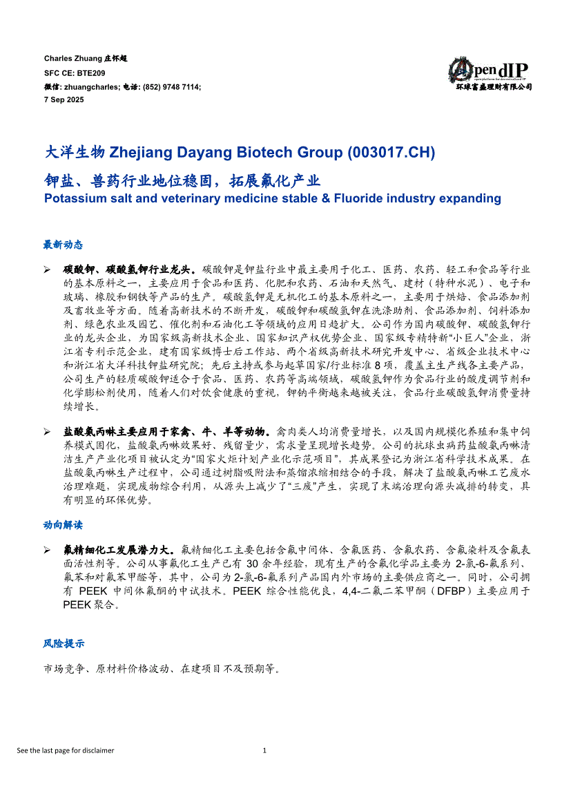 大洋生物:环球富盛-大洋生物-003017-钾盐、兽药行业地位稳固,拓展氟化产业-250907