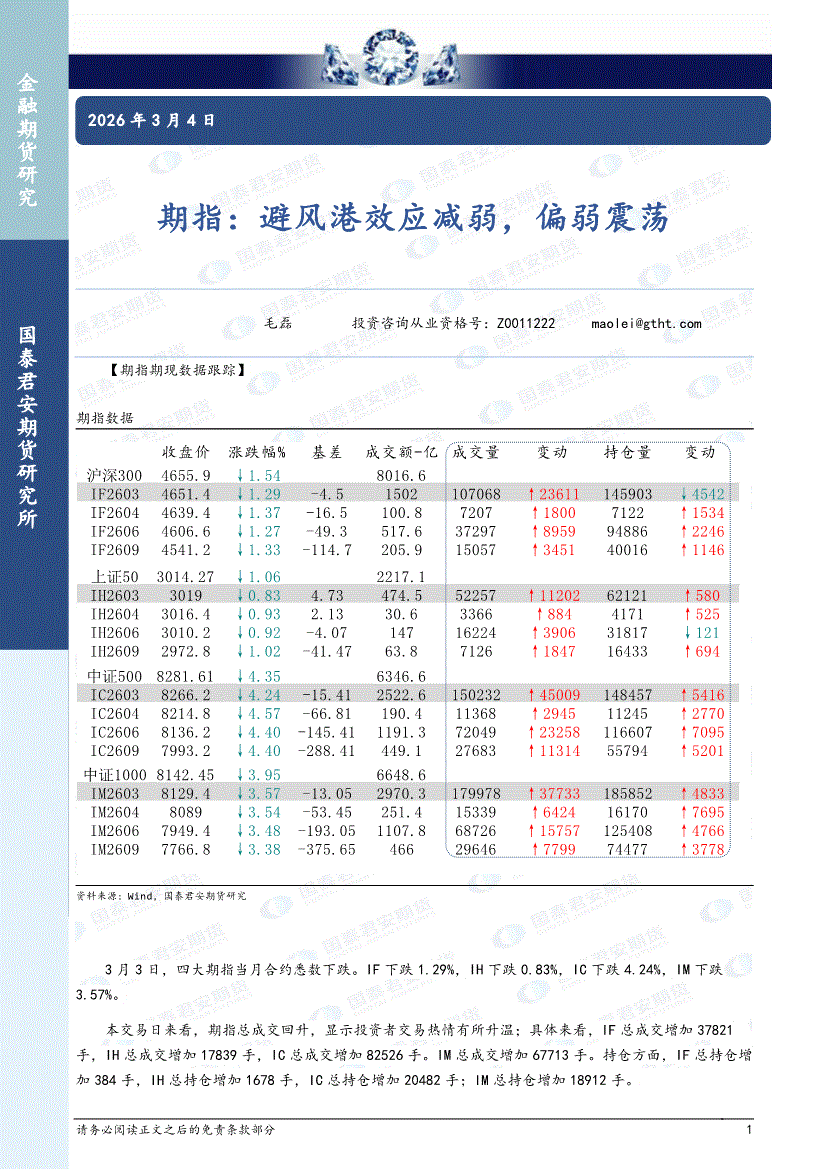 国泰君安期货-期指:避风港效应减弱,偏弱震荡-260304