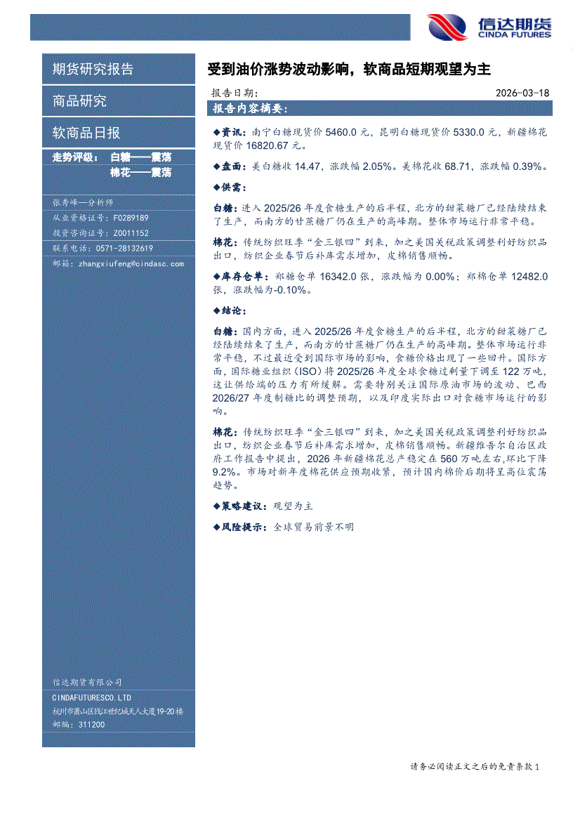 信达期货-软商品日报:受到油价涨势波动影响,软商品短期观望为主-260318