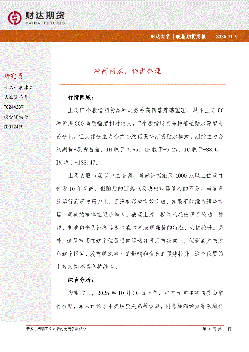 财达期货-股指期货周报:冲高回落,仍需整理-251103