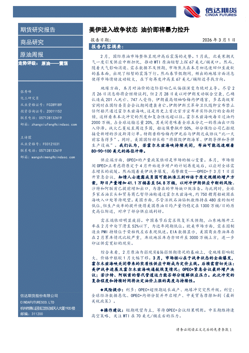 信达期货-原油周报:美伊进入战争状态,油价即将暴力拉升-260301