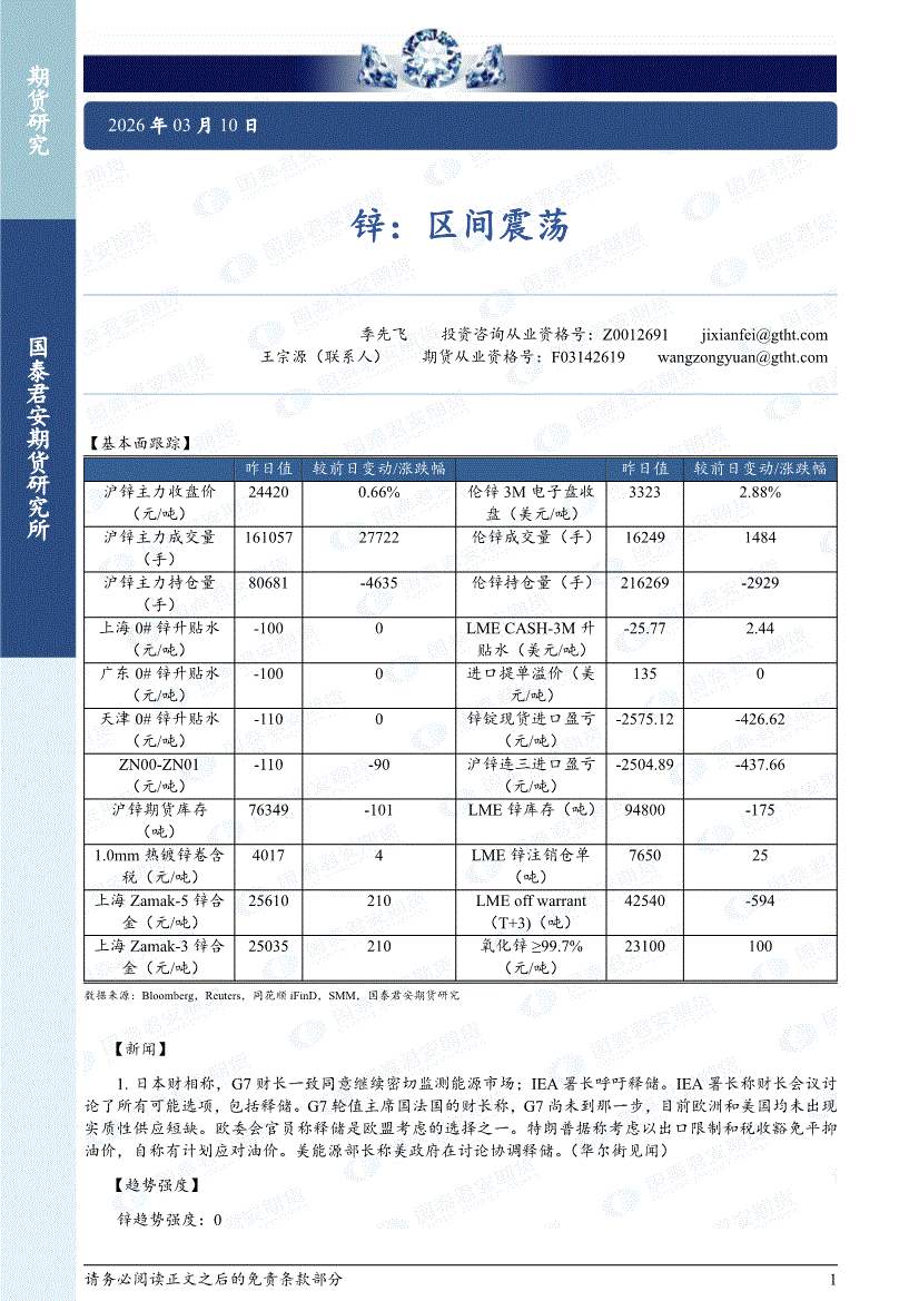 国泰君安期货-锌:区间震荡-260310