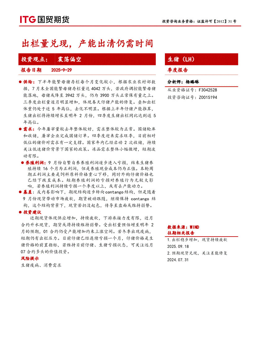 国贸期货-生猪季度报告:出栏量兑现,产能出清仍需时间-250929