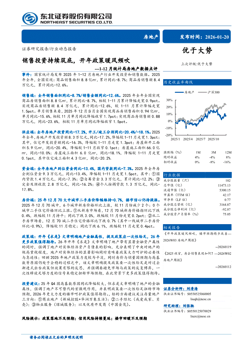 房地产行业:东北证券-1~12月统计局房地产行业数据点评:销售投资持续筑底,开年政策暖风频吹-260120