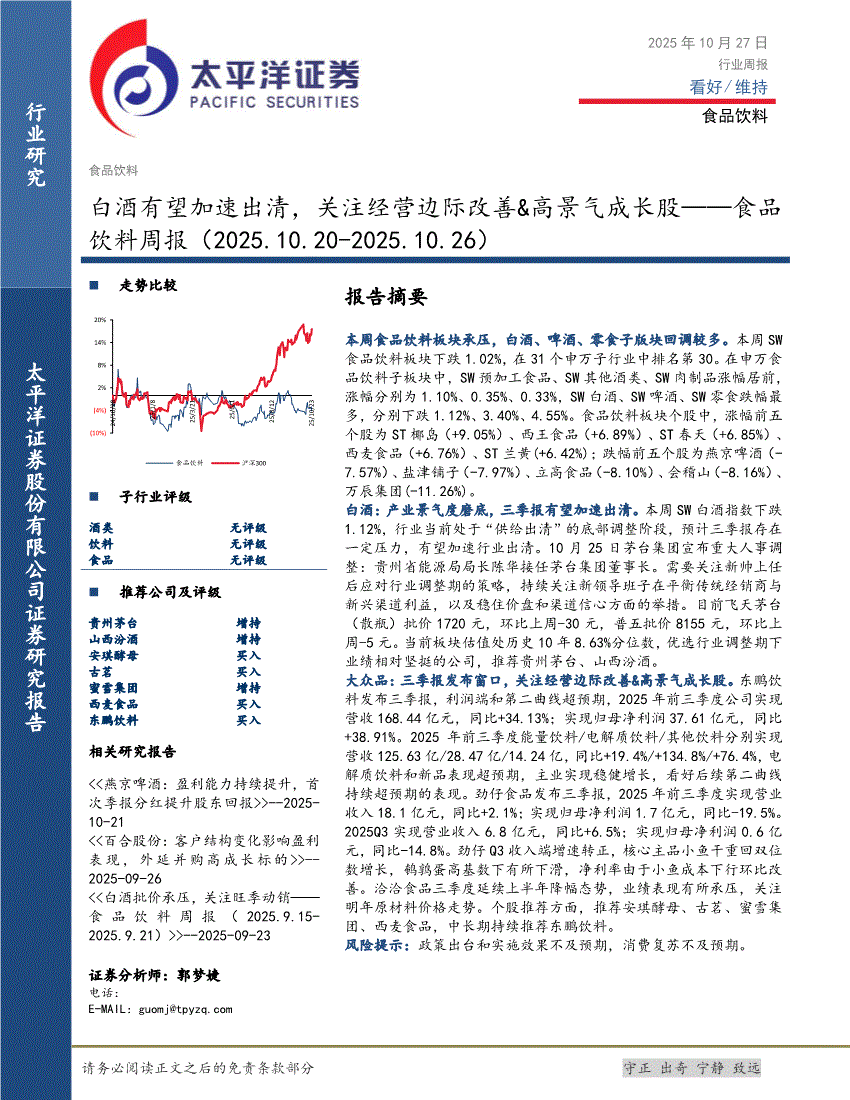 食品饮料行业:太平洋证券-食品饮料行业周报:白酒有望加速出清,关注经营边际改善&高景气成长股-251027