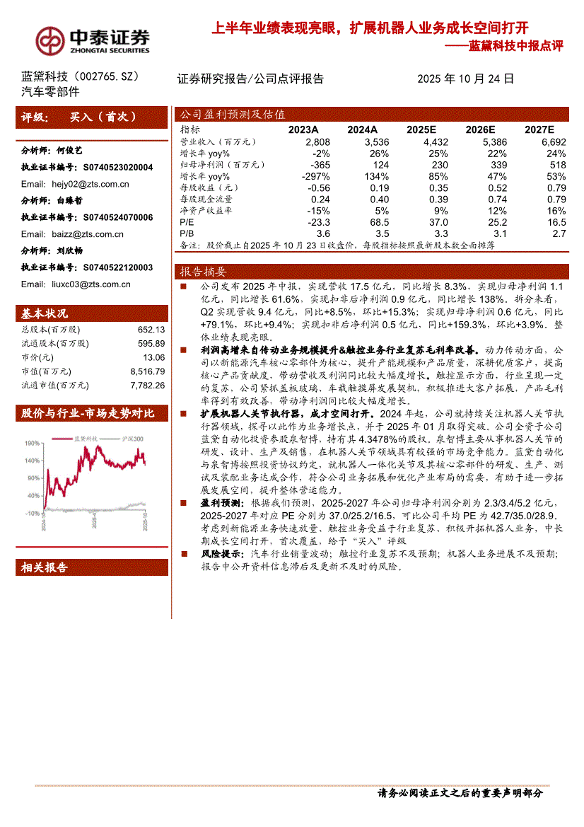 蓝黛科技:中泰证券-蓝黛科技-002765-中报点评:上半年业绩表现亮眼,扩展机器人业务成长空间打开-251024