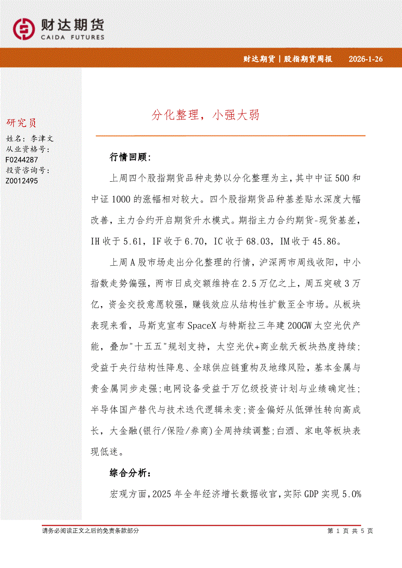 财达期货-股指期货周报:分化整理,小强大弱-260126