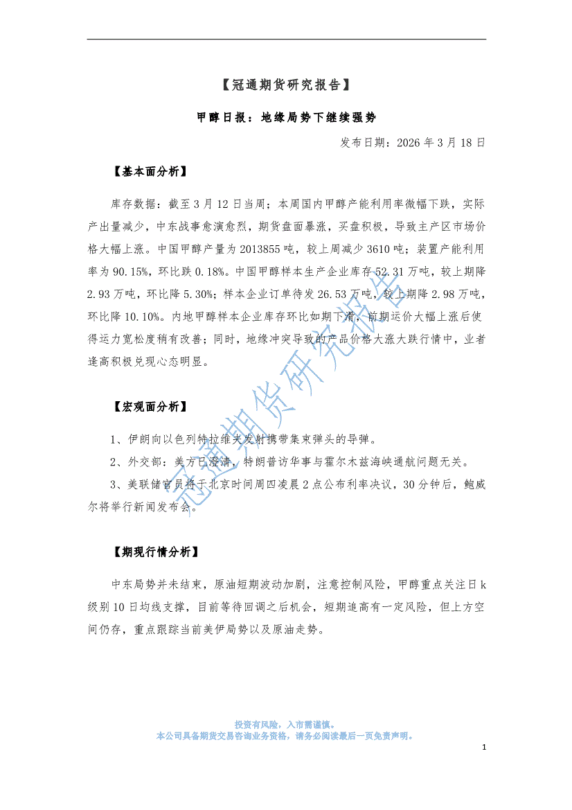 冠通期货-甲醇日报:地缘局势下继续强势-260318