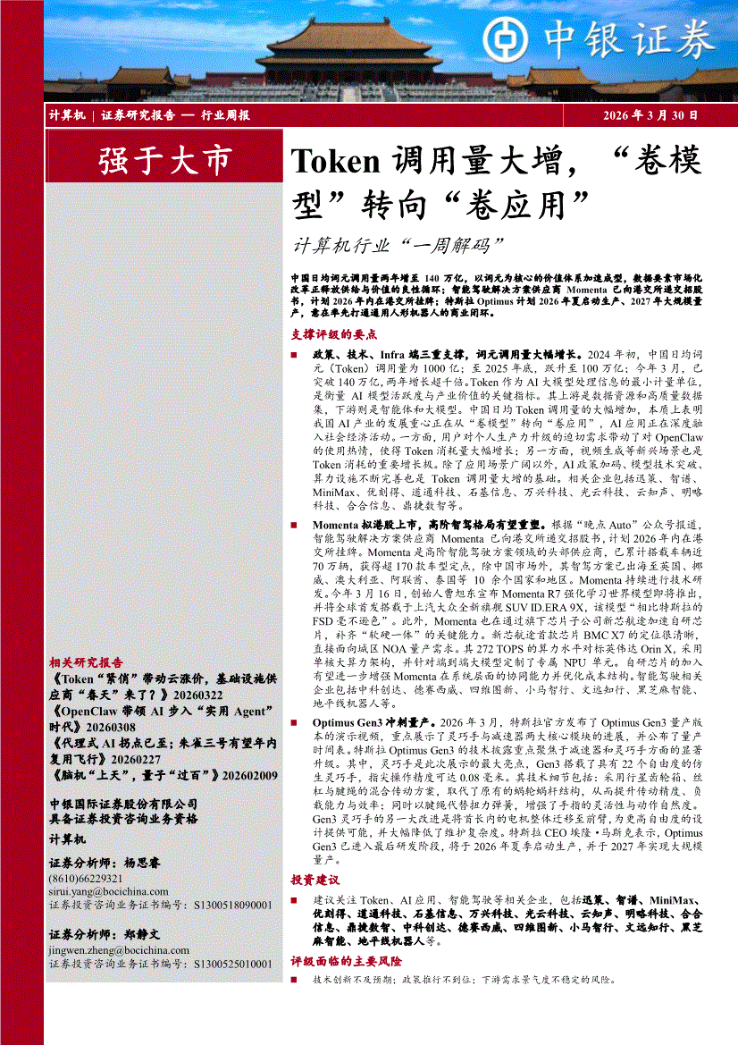 计算机行业:中银国际-计算机行业“一周解码”:Token调用量大增,“卷模型”转向“卷应用”-260330