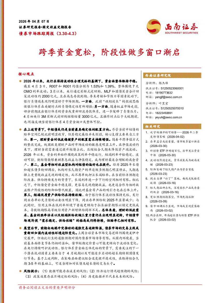 西南证券-债券市场跟踪周报:跨季资金宽松,阶段性做多窗口渐启-260407