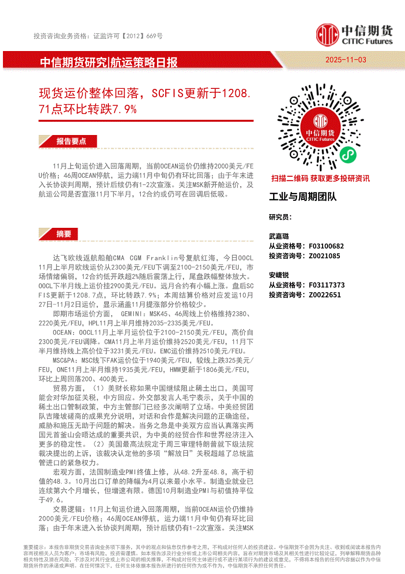 中信期货-航运策略日报:现货运价整体回落,SCFIS更新于1208.71点环比转跌7.9%-251103