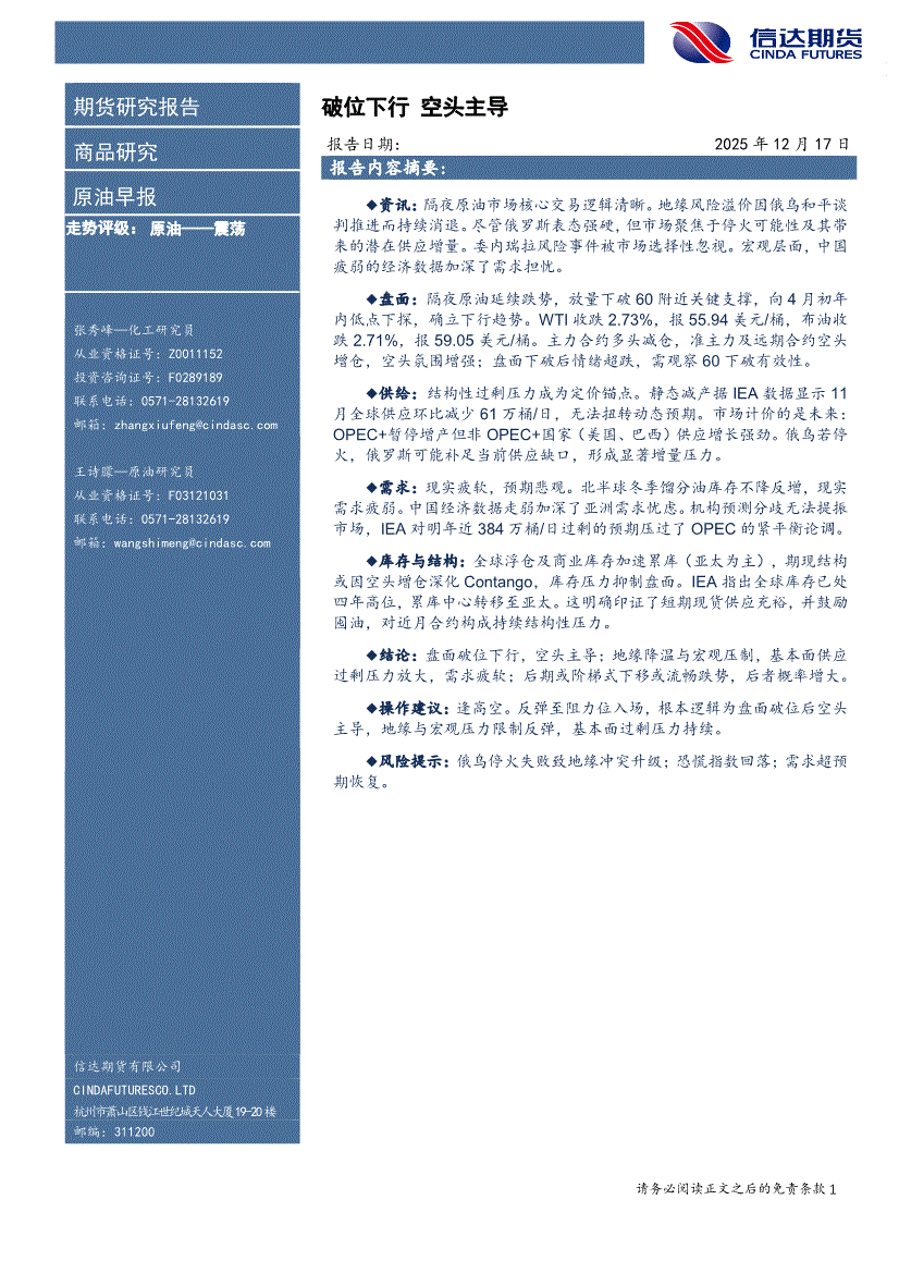 信达期货-原油周报:地缘扰动难敌供应压力,原油震荡收跌-251214