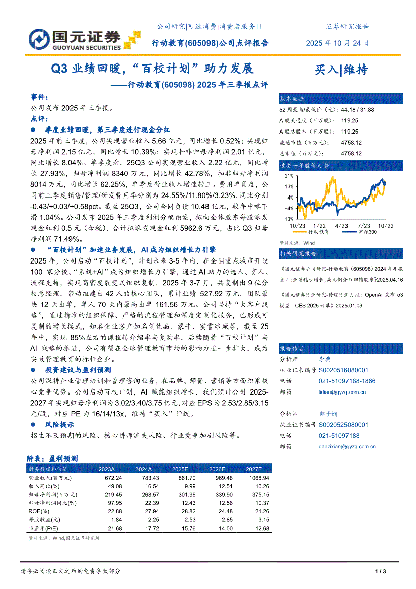 行动教育:国元证券-行动教育-605098-2025年三季报点评:Q3业绩回暖,“百校计划”助力发展-251024