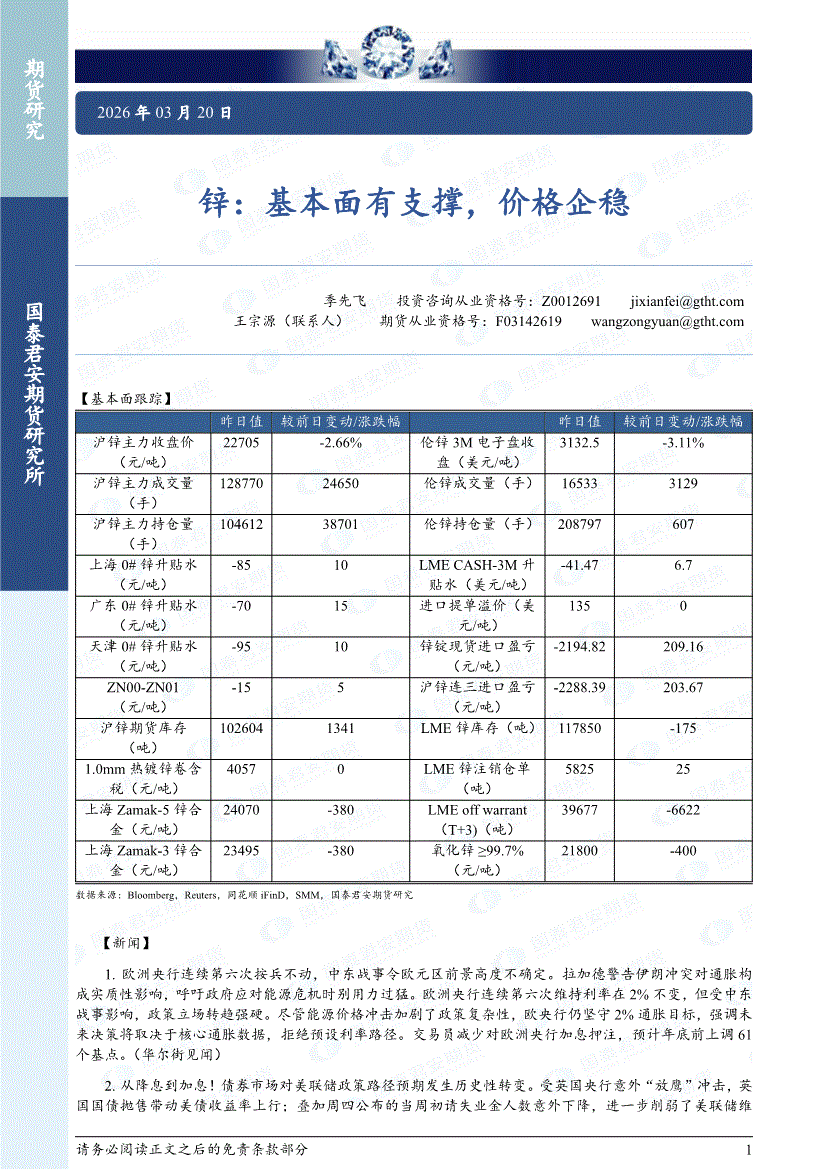 国泰君安期货-锌:基本面有支撑,价格企稳-260320