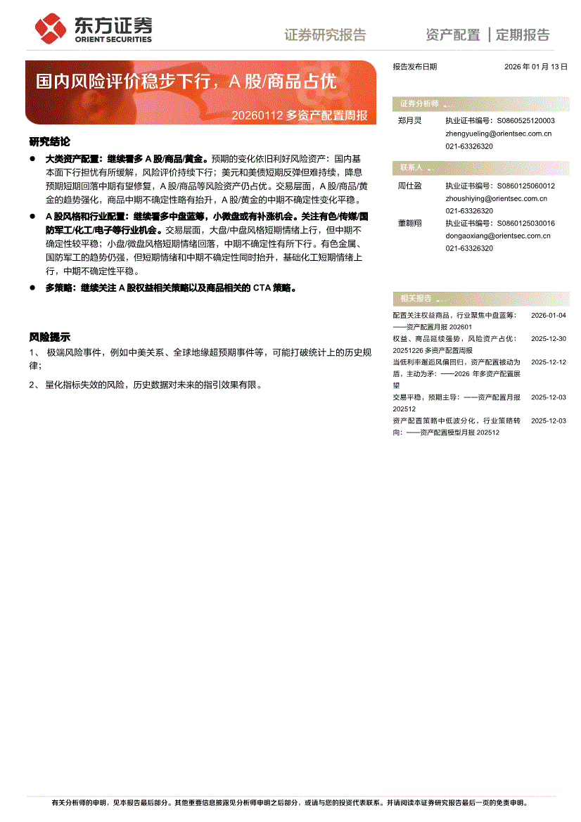 东方证券-多资产配置周报:国内风险评价稳步下行,A股/商品占优-260113