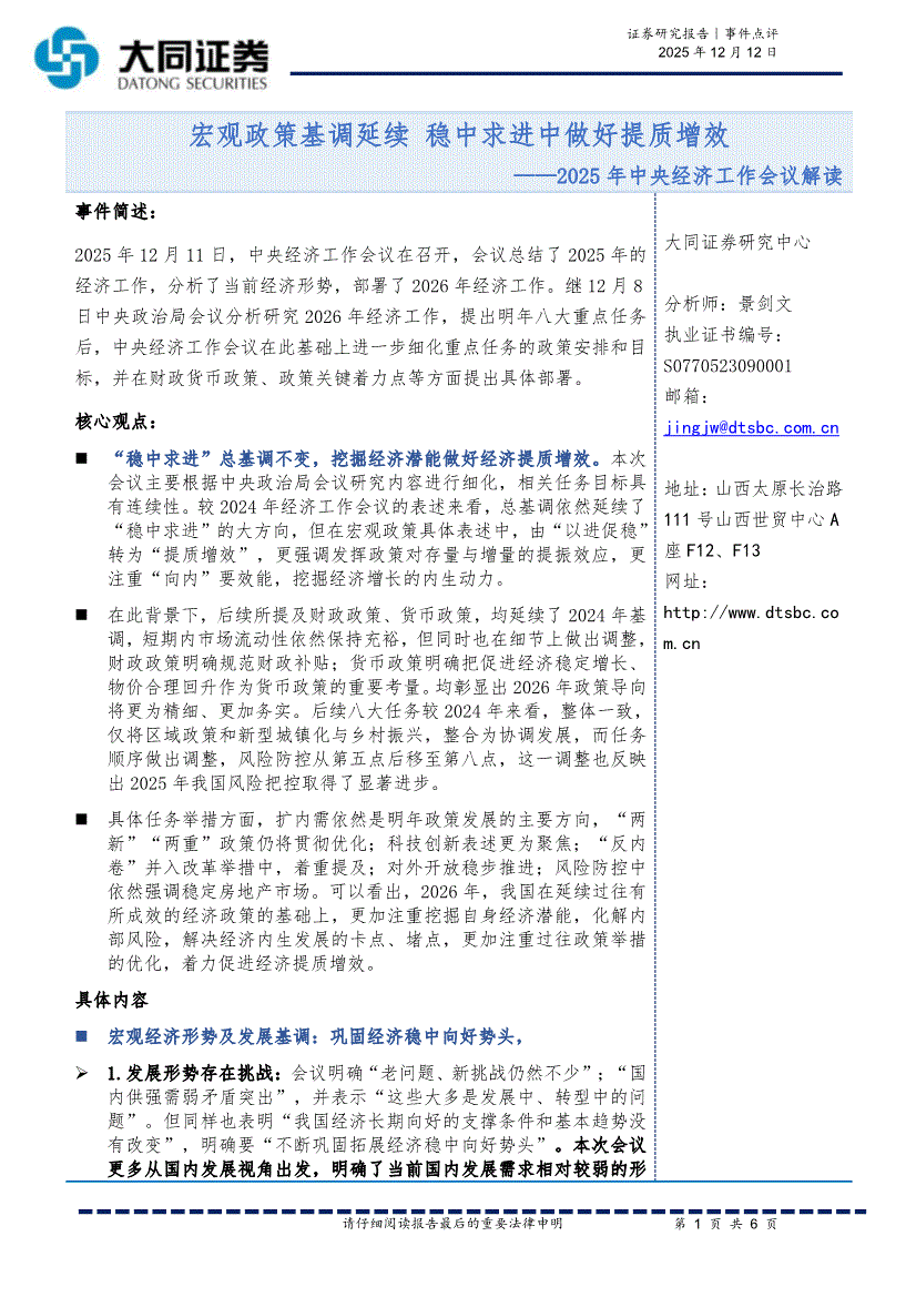 大同证券-2025年中央经济工作会议解读:宏观政策基调延续,稳中求进中做好提质增效-251212