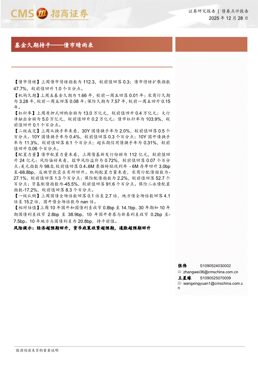 招商证券-基金久期小幅回落——债市晴雨表-251221