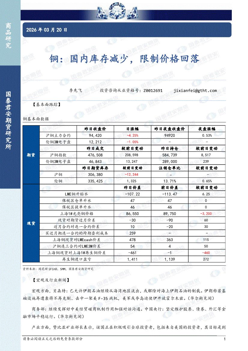 国泰君安期货-铜:国内库存减少,限制价格回落-260320