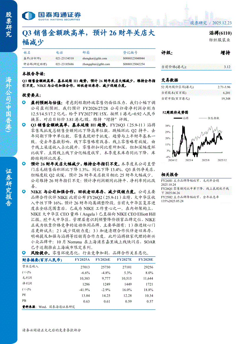 滔搏:国泰海通证券-滔搏-6110.HK-Q3销售金额跌高单,预计26财年关店大幅减少-251223