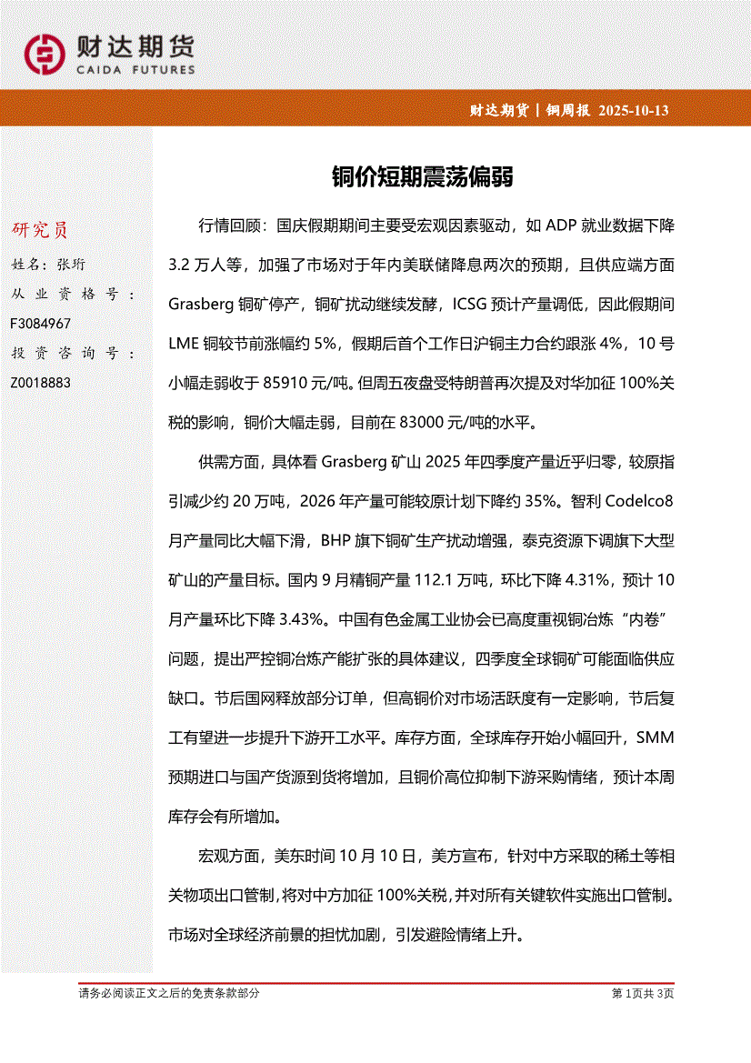 财达期货-铜周报:铜价短期震荡偏弱-251013