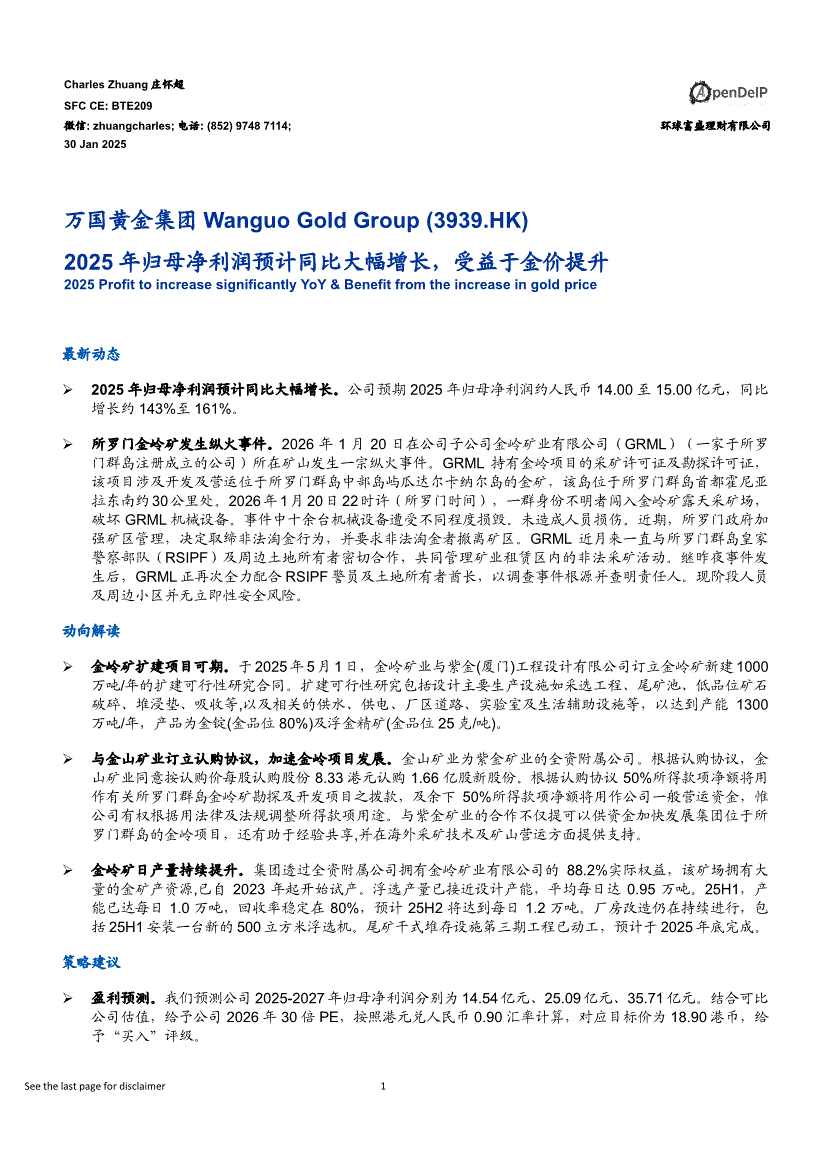 万国黄金集团:环球富盛-万国黄金集团-3939.HK-2025年归母净利润预计同比大幅增长,受益于金价提升-260130