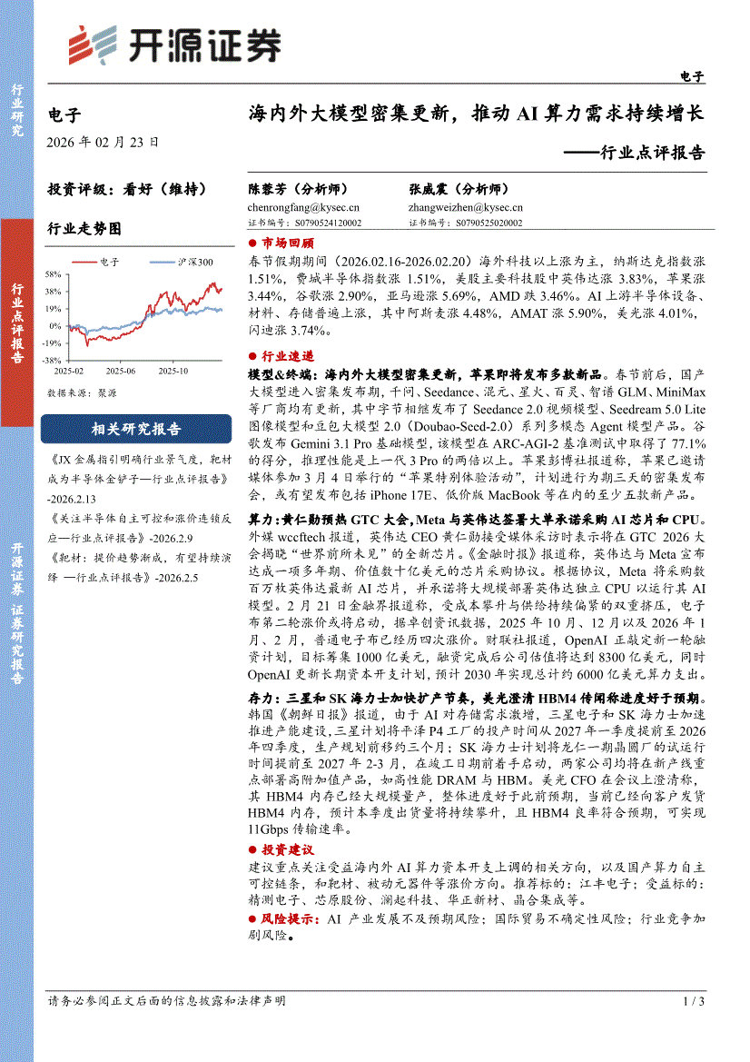 电子行业:开源证券-电子行业点评报告:海内外大模型密集更新,推动AI算力需求持续增长-260223