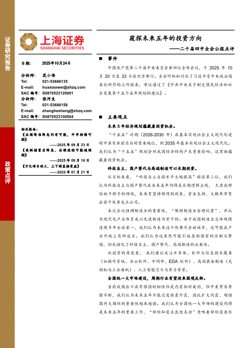 上海证券-二十届四中全会公报点评:窥探未来五年的投资方向-251024