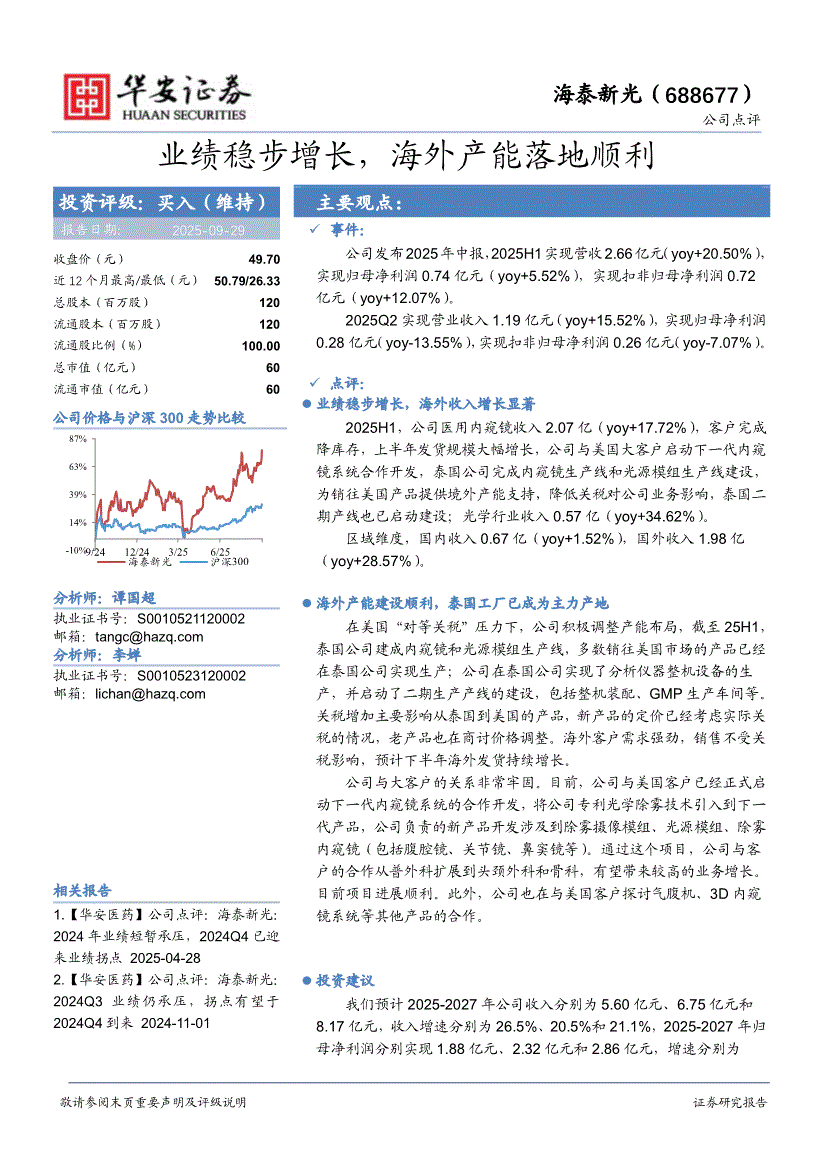 海泰新光:华安证券-海泰新光-688677-业绩稳步增长,海外产能落地顺利-250929