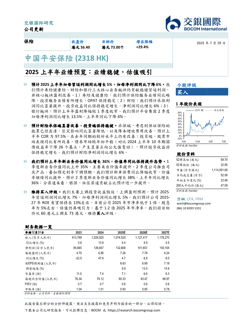 中国平安保险:交银国际-中国平安保险-2318.HK-2025上半年业绩预览:业绩稳健,估值吸引-250729