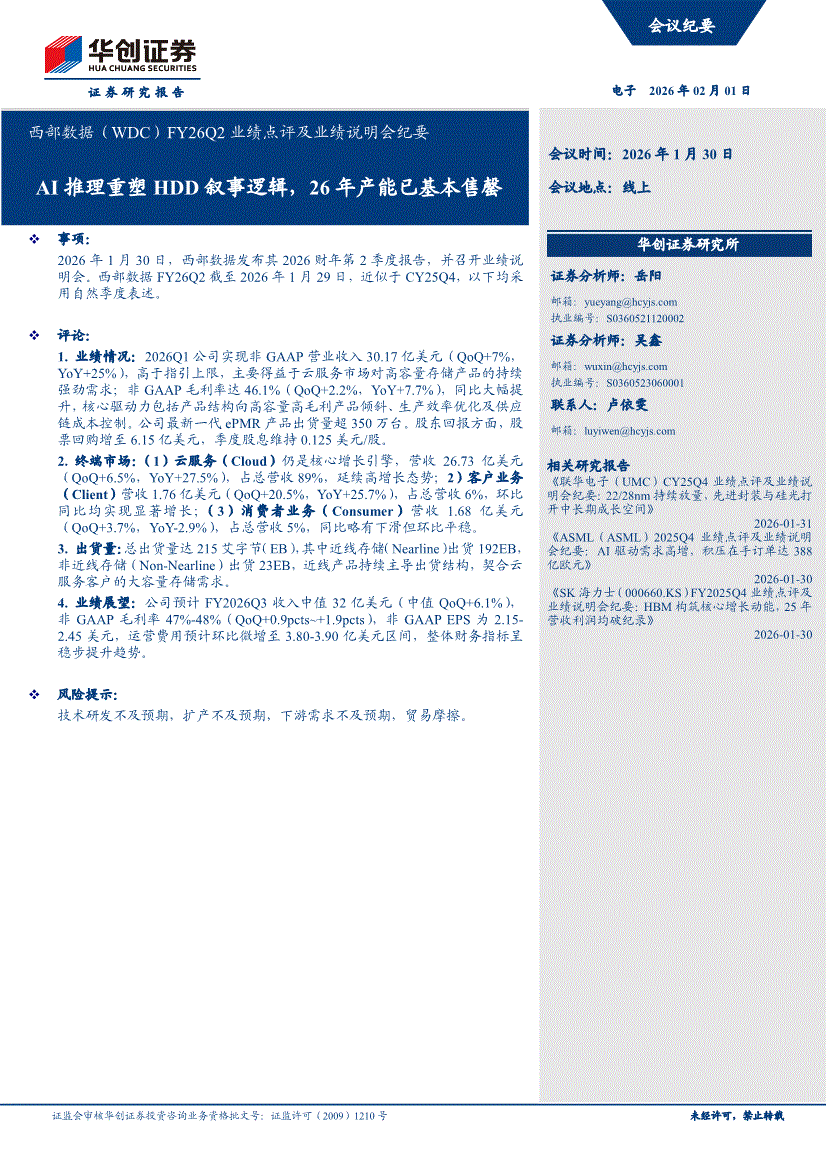 西部数据:华创证券-西部数据-WDC.US-FY26Q2业绩点评及业绩说明会纪要:AI推理重塑HDD叙事逻辑,26年产能已基本售罄-260201